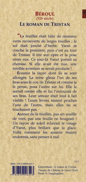 « La feuillée était faite de rameaux verts recouverts de larges feuilles ; le sol était jonché d'herbe. Yseut se couche la première, puis c'est au tour de Tristan. Il tire son épée et la pose entre eux. Ce jour-là Yseut portait sa chemise. Si elle avait été nue, une terrible aventure se serait produite !