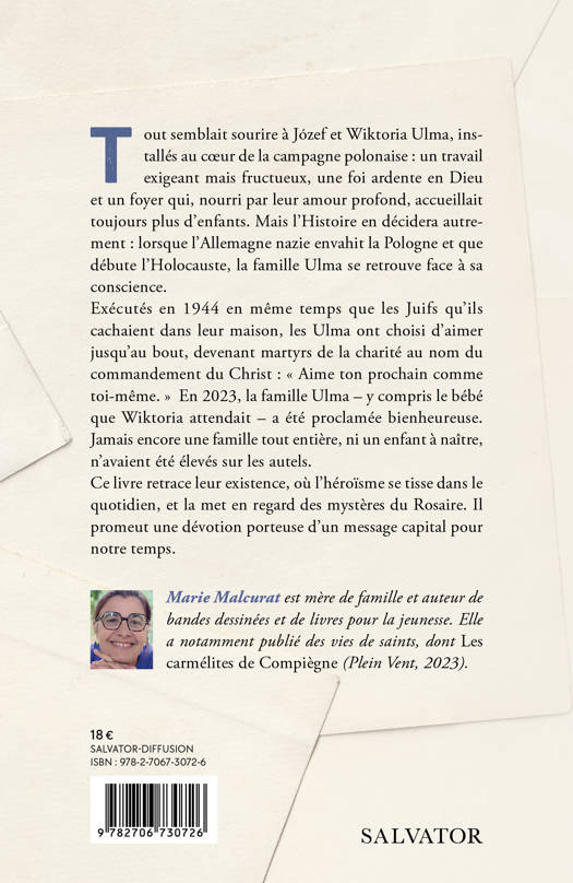 Tout semblait sourire à Józef et Wiktoria Ulma, installés au cÅur de la campagne polonaise : un travail exigeant mais fructueux, une foi ardente en Dieu et un foyer qui, nourri par leur amour profond, accueillait toujours plus d'enfants. Mais l'Histoire en décidera autrement : lorsque l'Allemagne nazie envahit la Pologne et que débute l'Holocauste, la famille Ulma se retrouve face à sa conscience. Exécutés en 1944 en même temps que les Juifs qu'ils cachaient dans leur maison, les Ulma ont choisi d'aimer jusqu'au bout, devenant martyrs de la charité au nom du commandement du Christ : « Aime ton prochain comme toi-même. » En 2023, la famille Ulma – y compris le bébé que Wiktoria attendait – a été proclamée bienheureuse. Jamais encore une famille tout entière, ni un enfant à naître, n'avaient été élevés sur les autels.