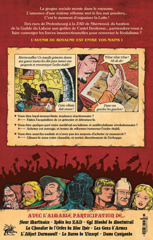 Des geôles de Castel Droitosse à la ZAD de Sherwood, des réunions secrètes des Chevaliers de l'Ordre du Bloc Noir aux AG tonitruantes de la Guilde du Labeur, organisez la convergence des luttes, fomentez la révolution, et renversez le féodalisme ! Votre quête commence à Prolosbourg, alors que l'annonce d'une énième réforme met le feu aux poudres dans le Royaume. L'histoire s'accélère, vous le sentez... mais comment transformer la grogne en énergie insurrectionnelle ? Radical ou modéré, violent ou pacifiste, à vous de décider comment organiser le mouvement !