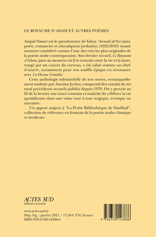 Amjad Nasser est le pseudonyme de Yahya ‘Awwad al-Nu'aymi, poète, romancier et chroniqueur jordanien (1955-2019) unanimement considéré comme l'une des voix les plus originales de la poésie arabe contemporaine. Son dernier recueil, «Le Royaume d'Adam», paru au moment où il se trouvait entre la vie et la mort, rongé par un cancer du cerveau, a été salué comme un chef-d'oeuvre, notamment pour son souffl e épique en résonance avec «La Divine Comédie».