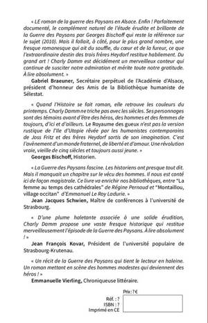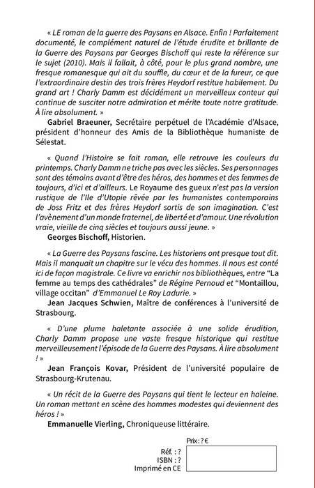 « LE roman de la guerre des Paysans en Alsace. Enfin ! Parfaitement documenté, le complément naturel de l'étude érudite et brillante de la Guerre des Paysans par Georges Bischoff qui reste la référence sur le sujet (2010). Mais il fallait, à côté, pour le plus grand nombre, une fresque romanesque qui ait du souffle, du cÅur et de la fureur, ce que l'extraordinaire destin des trois frères Heydorf restitue habilement. Du grand art ! Charly Damm est décidément un merveilleux conteur qui continue de susciter notre admiration et mérite toute notre gratitude. À lire absolument. » Gabriel Braeuner, Secrétaire perpétuel de l'Académie d'Alsace, président d'honneur des Amis de la Bibliothèque humaniste de Sélestat. « Quand l'Histoire se fait roman, elle retrouve les couleurs du printemps. Charly Damm ne triche pas avec les siècles. Ses personnages sont des témoins avant d'être des héros, des hommes et des femmes de toujours, d'ici et d'ailleurs. Le Royaume des gueux n'est pas la version rustique de l'Ile d'Utopie rêvée par les humanistes contemporains de Joss Fritz et des frères Heydorf sortis de son imagination. C'est l'avènement d'un monde fraternel, de liberté et d'amour. Une révolution vraie, vieille de cinq siècles et toujours aussi jeune. » Georges Bischoff, Historien. « La Guerre des Paysans fascine. Les historiens ont presque tout dit. Mais il manquait un chapitre sur le vécu des hommes. Il nous est conté ici de façon magistrale. Ce livre va enrichir nos bibliothèques, entre “La femme au temps des cathédrales” de Régine Pernoud et “Montaillou, village occitan” d'Emmanuel Le Roy Ladurie. » Jean Jacques Schwien, Maître de conférences à l'université de Strasbourg. « D'une plume haletante associée à une solide érudition, Charly Damm propose une vaste fresque historique qui restitue merveilleusement l'épisode de la Guerre des Paysans. À lire absolument ! » Jean François Kovar, Président de l'université populaire de Strasbourg-Krutenau. « Un récit de la Guerre des Paysans qui tient le lecteur en haleine. Un roman mettant en scène des hommes modestes qui deviennent des héros ! » Emmanuelle Vierling, Chroniqueuse littéraire.
