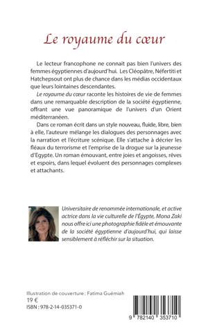 Le lecteur francophone ne connait pas bien l’univers des femmes égyptiennes d’aujourd’hui. Les Cléopâtre, Néfertiti et Hatchepsout ont plus de chance dans les médias occidentaux que leurs lointaines descendantes. Le royaume du cœur raconte les histoires de vie de femmes dans une remarquable description de la société égyptienne, offrant une vue panoramique de l’univers d’un Orient méditerranéen. Dans ce roman écrit dans un style nouveau, fluide, libre, bien à elle, l’auteure mélange les dialogues des personnages avec la narration et l’écriture scénique. Elle s’attache à décrier les fléaux du terrorisme et l’emprise de la drogue sur la jeunesse d’Egypte. Un roman émouvant, entre joies et angoisses, rêves et espoirs, dans lequel évoluent des personnages complexes et attachants.