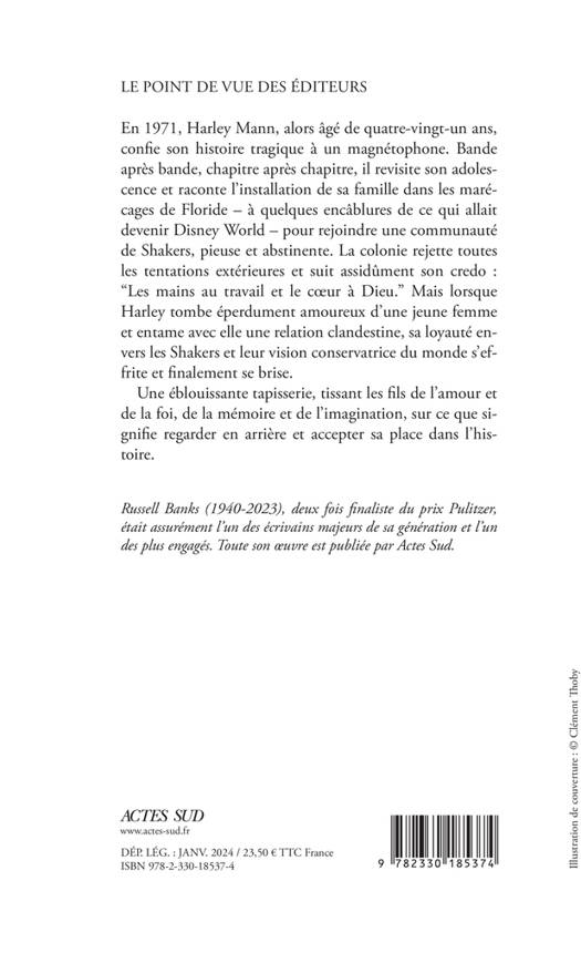 En 1971, Harley Mann, alors âgé de quatre-vingt-un ans, confie son histoire tragique à un magnétophone. Bande après bande, chapitre après chapitre, il revisite son adolescence et raconte l'installation de sa famille dans les marécages de Floride - à quelques encâblures de ce qui allait devenir Disney World - pour rejoindre une communauté de Shakers, pieuse et abstinente. La colonie rejette toutes les tentations extérieures et suit assidûment son credo : "Les mains au travail et le coeur à Dieu." Mais lorsque Harley tombe éperdument amoureux d'une jeune femme et entame avec elle une relation clandestine, sa loyauté envers les Shakers et leur vision conservatrice du monde s'effrite et finalement se brise. Une éblouissante tapisserie, tissant les fils de l'amour et de la foi, de la mémoire et de l'imagination, sur ce que signifie regarder en arrière et accepter sa place dans l'histoire.