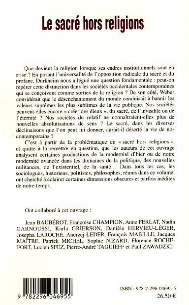 A partir de la distinction posée par Durkheim entre sacré et profane, cet essai pluridisciplinaire tente de repérer dans nos sociétés laïques contemporaines des formes modernes de religiosité : les notions de sens, de symbole, d'absolu, ne sont-elles pas autant de nouvelles divinités créées pour se substituer aux anciennes ?