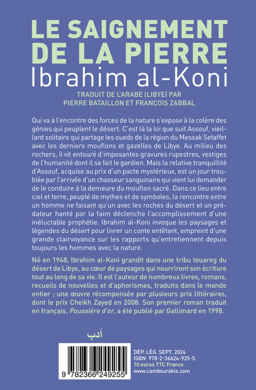 Qui va à l'encontre des forces de la nature s'expose à la colère des génies qui peuplent le désert. C'est là la loi que suit Assouf, vieillard solitaire qui partage les oueds de la région du Messak Setaffet avec les derniers mouflons et gazelles de Libye. Au milieu des rochers, il vit entouré d'imposantes gravures rupestres, vestiges de l'humanité dont il se fait le gardien. Mais la relative tranquillité d'Assouf, acquise au prix d'un pacte mystérieux, est un jour troublée par l'arrivée d'un chasseur sanguinaire qui vient lui demander de le conduire à la demeure du mouflon sacré. Dans ce lieu entre ciel et terre, peuplé de mythes et de symboles, la rencontre entre un homme ne faisant qu'un avec les roches du désert et un prédateur hanté par la faim déclenche l'accomplissement d'une inéluctable prophétie. Ibrahim al-Koni invoque les paysages et légendes du désert pour livrer un conte entêtant, empreint d'une grande clairvoyance sur les rapports qu'entretiennent depuis toujours les hommes avec la nature.