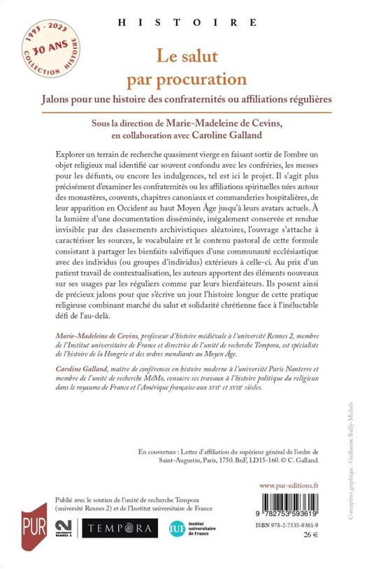 Explorer un terrain de recherche quasiment vierge en faisant sortir de l’ombre un objet religieux mal identifié car souvent confondu avec les confréries, les messes pour les défunts, ou encore les indulgences, tel est ici le projet. Il s’agit plus précisément d’examiner les confraternités ou les affiliations spirituelles nées autour des monastères, couvents, chapitres canoniaux et commanderies hospitalières, de leur apparition en Occident au haut Moyen Âge jusqu’à leurs avatars actuels. À la lumière d’une documentation disséminée, inégalement conservée et rendue invisible par des classements archivistiques aléatoires, l’ouvrage s’attache à caractériser les sources, le vocabulaire et le contenu pastoral de cette formule consistant à partager les bienfaits salvifiques d’une communauté ecclésiastique avec des individus (ou groupes d’individus) extérieurs à celle-ci. Au prix d’un patient travail de contextualisation, les auteurs apportent des éléments nouveaux sur ses usages par les réguliers comme par leurs bienfaiteurs. Ils posent ainsi de précieux jalons pour que s’écrive un jour l’histoire longue de cette pratique religieuse combinant marché du salut et solidarité chrétienne face à l’inéluctable défi de l’au-delà.