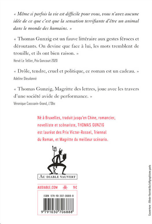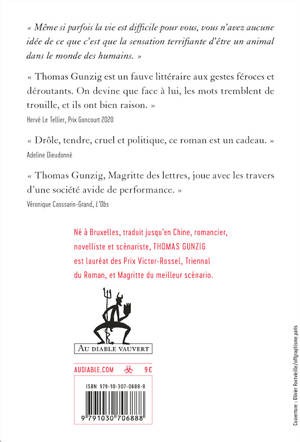 Même si parfois la vie est difficile pour vous, vous n'avez aucune idée de ce que c'est que la sensation terrifiante d'être un animal dans le monde des humains. Thomas Gunzig est un fauve littéraire aux gestes féroces et déroutants. On devine que face à lui, les mots tremblent de trouille, et ils ont bien raison. Hervé Le Tellier, Prix Goncourt 2020 Drôle, tendre, cruel et politique, ce roman est un cadeau. Adeline Dieudonné Thomas Gunzig, Magritte des lettres, joue avec les travers d'une société avide de performance. Véronique Casssarin-Grand, L'ObsNé à Bruxelles, traduit jusqu'en Chine, romancier, novelliste et scénariste, Thomas Gunzig est lauréat des Prix Victor-Rossel, Triennal du Roman, et Magritte du meilleur scénario.