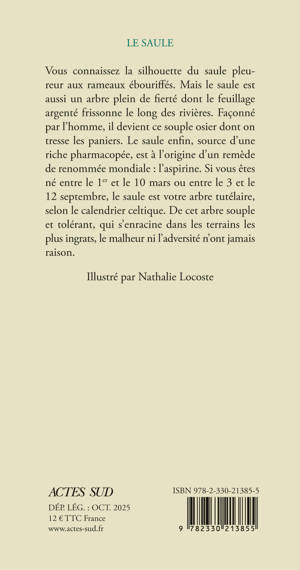 Une nouvelle édition avec rabats, sur papier de qualité, pour une collection emblématique « Le Nom de l'arbre » qui détaille l'anatomie et les besoins de chaque espèce et dévoile leur personnalité symbolique et leur place dans notre imaginaire. Vous connaissez la silhouette du saule pleureur aux rameaux ébouriffés. Mais le saule est aussi un arbre plein de fierté dont le feuillage argenté frissonne le long des rivières. Façonné par l'homme, il devient ce souple osier dont on tresse les paniers. Le saule enfin, source d'une riche pharmacopée, est à l'origine d'un remède de renommée mondiale : l'aspirine. Si vous êtes né entre le 1er et le 10 mars ou entre le 3 et le 12 septembre, le saule est votre arbre tutélaire, selon le calendrier celtique. De cet arbre souple et tolérant, qui s'enracine dans les terrains les plus ingrats, le malheur ni l'adversité n'ont jamais raison.