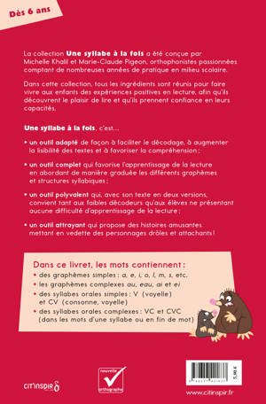 Série rouge Un bébé taupe a mal à la patte. Un renard rôde. Il avalera le bébé si Rémi ne le sauve pas. Dans ce livre, les mots contiennent : des graphèmes simples : a, e, i, o, l, m, s, etc. les graphèmes complexes au, eau, ai et ei des syllabes orales simples : V (voyelle) et CV (consonne, voyelle) des syllabes orales complexes : VC et CVC (dans les mots d’une syllabe ou en fin de mot)