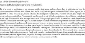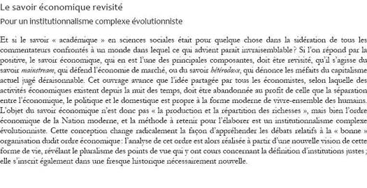 Et si le savoir « académique » en sciences sociales était pour quelque chose dans la sidération de tous les commentateurs confrontés à un monde dans lequel ce qui advient paraît invraisemblable ? Si l’on répond par la positive, le savoir économique, qui en est l’une des principales composantes, doit être revisité, qu’il s’agisse du savoir mainstream, qui défend l’économie de marché, ou du savoir hétérodoxe, qui dénonce les méfaits du capitalisme actuel jugé déraisonnable. Cet ouvrage avance que l’idée partagée par tous les économistes, selon laquelle des activités économiques existent depuis la nuit des temps, doit être abandonnée au profit de celle que la séparation entre l’économique, le politique et le domestique est propre à la forme moderne de vivre-ensemble des humains. L’objet du savoir économique n’est donc pas « la production et la répartition des richesses », mais bien l’ordre économique de la Nation moderne, et la méthode à retenir pour l’élaborer est un institutionnalisme complexe évolutionniste. Cette conception change radicalement la façon d’appréhender les débats relatifs à la « bonne » organisation dudit ordre économique : l’analyse de cet ordre est alors réalisée à partir d’une nouvelle vision de cette forme de vie, révélant le pluralisme des points de vue qui y ont cours concernant la définition d’institutions justes ; elle s’inscrit également dans une fresque historique nécessairement nouvelle.