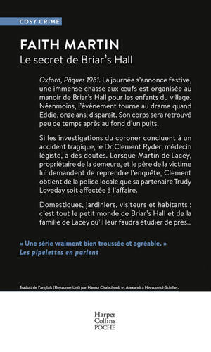 Oxford, Pâques 1961. La journée s’annonce festive, une immense chasse aux œufs est organisée au manoir de Briar’s Hall pour les enfants du village. Néanmoins, l’événement tourne au drame quand Eddie, onze ans, disparaît. Son corps sera retrouvé peu de temps après au fond d’un puits. Si les investigations du coroner concluent à un accident tragique, le Dr Clement Ryder, médecin légiste, a des doutes. Lorsque Martin de Lacey, propriétaire de la demeure, et le père de la victime lui demandent de reprendre l’enquête, Clement obtient de la police locale que sa partenaire Trudy Loveday soit affectée à l’affaire. Domestiques, jardiniers, visiteurs et habitants : c’est tout le petit monde de Briar’s Hall et de la famille de Lacey qu’il leur faudra étudier de près… Traduit de l'anglais (Royaume-Uni) par Hanna Chabchoub et Alexandra Herscovici-Schiller.