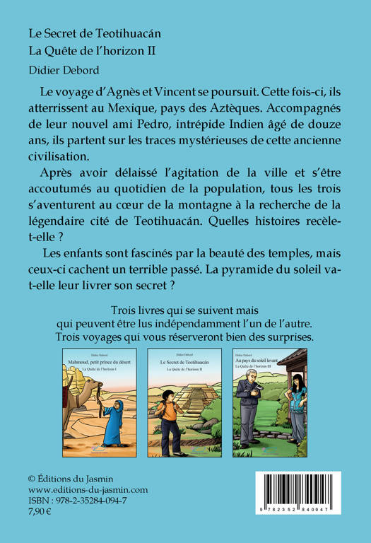 Le voyage d’Agnès et Vincent se poursuit. Cette fois-ci, ils atterrissent au Mexique, pays des Aztèques. Accompagnés de leur nouvel ami Pedro, intrépide Indien âgé de douze ans, ils partent sur les traces mystérieuses de cette ancienne civilisation. Après avoir délaissé l’agitation de la ville et s’être accoutumés au quotidien de la population, tous les trois s’aventurent au cœur de la montagne à la recherche de la légendaire cité de Teotihuacán. Quelles histoires recèle- t-elle ? Les enfants sont fascinés par la beauté des temples, mais ceux-ci cachent un terrible passé. La pyramide du soleil va-t-elle leur livrer son secret ?
