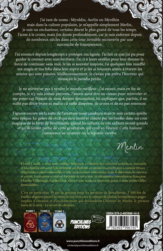 LE TERRIBLE SECRET DE BROCÉLIANDE ENFIN RÉVÉLÉ Découvrez le destin épique de Merlin, dans cette captivante saga de magie, de courage et de persévérance qui transcende les siècles. J'ai tant de noms: Myrddin, Aerlin ou Myrdhin mais dans la culture populaire, je m'appelle simplement Merlin, je suis un enchanteur, certains disent le plus grand de tous les temps. J'aime à le croire, mais j'en doute profondément, car je suis enfermé depuis de nombreux siècles dans cette tour invisible recouverte par une surcouche de transparence.