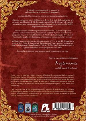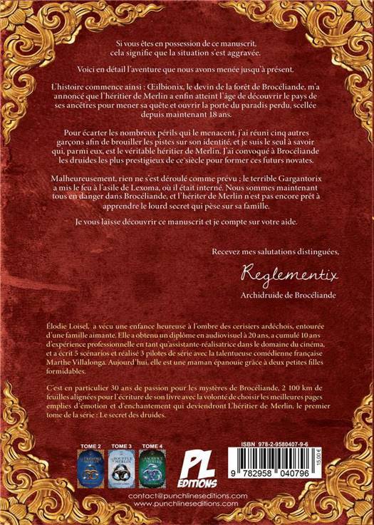Si vous êtes en possession de ce manuscrit, cela signifie que la situation s'est aggravée. Voici en détail l'aventure que nous avons menée jusqu'à présent. L'histoire commence ainsi : Oeilbionix, le devin de la forêt de Brocéliande, m'a annoncé que l'héritier de Merlin a enfin atteint l'age de découvrir le pays de ses ancêtres pour mener sa quête et ouvrir la porte du paradis perdu, scellée depuis maintenant 18 ans. Pour écarter les nombreux périls qui le menacent, j'ai réuni cinq autres garçons afin de brouiller les pistes sur son identité, et je suis le seul à savoir qui, parmi eux, est le véritable Héritier de Merlin. J'ai convoqué à Brocéliande, les druides les plus prestigieux de ce siècle pour former ces futurs novates. Malheureusement, rien ne s'est déroulé comme prévu ; le terrible Gargantorix a mis le feu à l'asile de Lexoma, où il était interné. Nous sommes maintenant tous en danger dans Brocéliande et l'Héritier de Merlin n'est pas encore prêt à apprendre le lourd secret qui pèse sur sa famille. Je vous laisse découvrir ce manuscrit et je compte sur votre aide. Recevez mes salutations distinguées Reglementix - Archidruide de Brocéliande