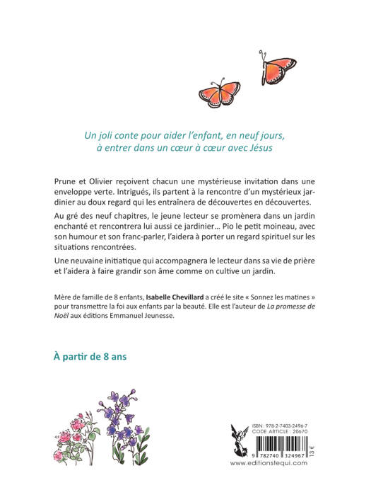 Prune et Olivier reçoivent chacun une mystérieuse invitation dans une enveloppe verte. Sur les pas du jardinier, ils vont rencontrer un jardinier au doux regard qui va les entraîner de découvertes en découvertes. Au gré des neuf chapitres, l’enfant se promènera dans un jardin enchanté et partira à la rencontre de ce mystérieux jardinier… Pio le petit moineau, avec son humour et son franc-parler, l’aidera à porter un regard spirituel sur les situations rencontrées. Un bon outil pour accompagner l’enfant dans la découverte de la vie de prière.