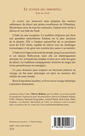 Le sentier des immortels nous propulse des sentiers sablonneux du désert aux pentes rocailleuses de l’Himalaya. Mystérieuse terre de tous les contrastes, l’auteur nous invite à découvrir son Inde du Nord. L’Inde est une exception. La tradition religieuse qui dicte son quotidien (polythéisme hindou) est la plus ancienne de la planète. Elle a l’audace aujourd’hui de se proclamer reine du XXIe siècle, capable de relever tous les challenges économiques et de gérer son système des castes à sa manière. L’Inde est à l’opposé du reste du monde, jusqu’à sa nourriture et ses danses Bollywood, mais elle est diaboliquement attirante. Ici, la beauté des temples rivalise avec celle des gens du désert, les traditions campagnardes éclairent de magie des terres poussiéreuses ou enneigées. Ce pays demeure pour toujours un fascinant prétexte au voyage, un but pour quiconque est épris ou soucieux des réalités de notre monde. Récit d’anecdotes insolites, ce livre est un voyage initiatique à plusieurs dimensions.