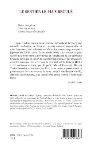 Le sentier le plus reculé. Elle nous offre la pertinence et l'originalité de son approche littéraire ainsi que sa vision de la culture japonaise, et par extension, de notre humanité. Cette version de très haut vol du texte de Bashõ a été entièrement revue par le poète Michel Falempin. Hiromi Tsukui introduit elle-même son livre dans un texte passionnant et prémonitoire