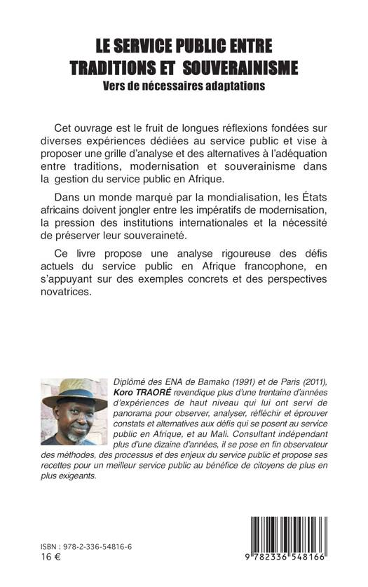 Cet ouvrage est le fruit de longues réflexions fondées sur diverses expériences dédiées au service public et vise à proposer une grille d'analyse et des alternatives à l'adéquation entre traditions, modernisation et souverainisme dans la gestion du service public en Afrique. Dans un monde marqué par la mondialisation, les États africains doivent jongler entre les impératifs de modernisation, la pression des institutions internationales et la nécessité de préserver leur souveraineté. Ce livre propose une analyse rigoureuse des défis actuels du service public en Afrique francophone, en s'appuyant sur des exemples concrets et des perspectives novatrices.