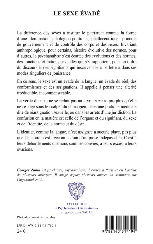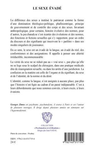 La différence des sexes a institué le patriarcat comme la forme d'une domination théologico-politique, phallocentrique, principe de gouvernement et de contrôle des corps et des sexes. Invariant anthropologique, pour certains, histoire évolutive des normes, pour d'autres, la psychanalyse s'est écartée des évolutions et des normes, des fonctions et fictions sexuelles qui s'y rapportent, pour un ordre du discours et des signifiants qui inscrivent le « parlêtre » dans ses modes singuliers de jouissance. En ce sens, le sexe est un évadé de la langue, un évadé du réel, des conformismes et des assignations. Il appelle à penser une altérité irréductible, incommensurable. La vérité du sexe ne se réduit pas au « vrai sexe », pas plus qu'elle ne se loge sous le scalpel du chirurgien, dans une pratique médicale dite de réassignation sexuelle, ou dans les arrêts d'une juridiction. La confusion en la matière est celle de l'organe et du signifiant, du sexe et de l'identité, de la norme et du désir. L'identité, comme la langue, n'est assignée à aucune place, pas plus que l'histoire n'est figée au cadran d'un passé indépassable. C'est à leurs débordements que nous sommes conviés, à leurs excès, à leurs évasions.