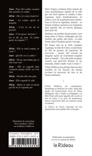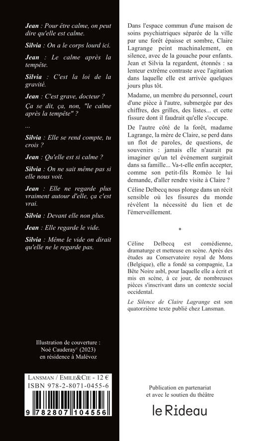 Dans l'espace commun d'une maison de soins psychiatriques séparée de la ville par une forêt épaisse et sombre, Claire Lagrange peint machinalement, en silence, avec de la gouache pour enfants. Jean et Silvia la regardent, étonnés : sa lenteur extrême contraste avec l'agitation dans laquelle elle est arrivée quelques jours plus tôt. Madame, un membre du personnel, court d'une pièce à l'autre, submergée par des chiffres, des grilles, des listes… et cette fissure dont il faudrait qu'elle s'occupe. De l'autre côté de la forêt, madame Lagrange, la mère de Claire, se perd dans un flot de paroles, de questions, de souvenirs : jamais elle n'aurait pu imaginer qu'un tel événement surgirait dans sa famille… Va-t-elle enfin accepter, comme son petit-fils Roméo le lui demande, d'aller rendre visite à Claire ? Céline Delbecq nous plonge dans un récit sensible où les fissures du monde révèlent la nécessité du lien et de l'émerveillement.