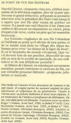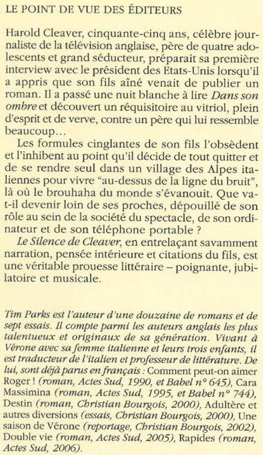 Harold Cleaver, célèbre journaliste de la télévision anglaise, père d'une famille à multiples crises et homme à multiples femmes quitte tout (famille, pays, travail) le lendemain de la parution du roman autobiographique de son fils. Se réfugiant dans un hameau alpin et découvrant, au centre de l'Europe, un quotidien archaïque, saura-t-il fuir ses pensées oppressantes, ses remords ? Que restera-t-il de lui, ainsi dépouillé de ses téléphones portables, de son ordinateur, des caméras, des journaux ? Que deviendra-t-il ? Le nouveau roman de Tim Parks est une prouesse littéraire plein d'humour noir et de suspense.