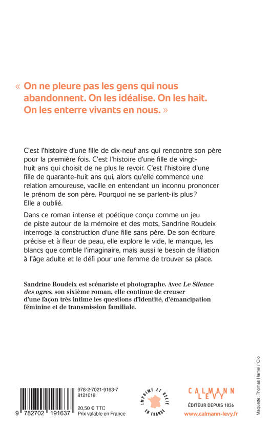 C’est l’histoire d’une fille de dix-neuf ans qui rencontre son père pour la première fois. C’est l’histoire d’une fille de vingthuit ans qui choisit de ne plus le revoir. C’est l’histoire d’une fille de quarante-huit ans qui, alors qu’elle commence une relation amoureuse, vacille en entendant un inconnu prononcer le prénom de son père. Pourquoi ne se parlent-ils plus ? Elle a oublié. Dans ce roman intense et poétique conçu comme un jeu de piste autour de la mémoire et des mots, Sandrine Roudeix interroge la construction d’une fille sans père. De son écriture précise et à fleur de peau, elle explore le vide, le manque, les blancs que comble l’imaginaire, mais aussi le besoin de filiation à l’âge adulte et le défi pour une femme de trouver sa place.