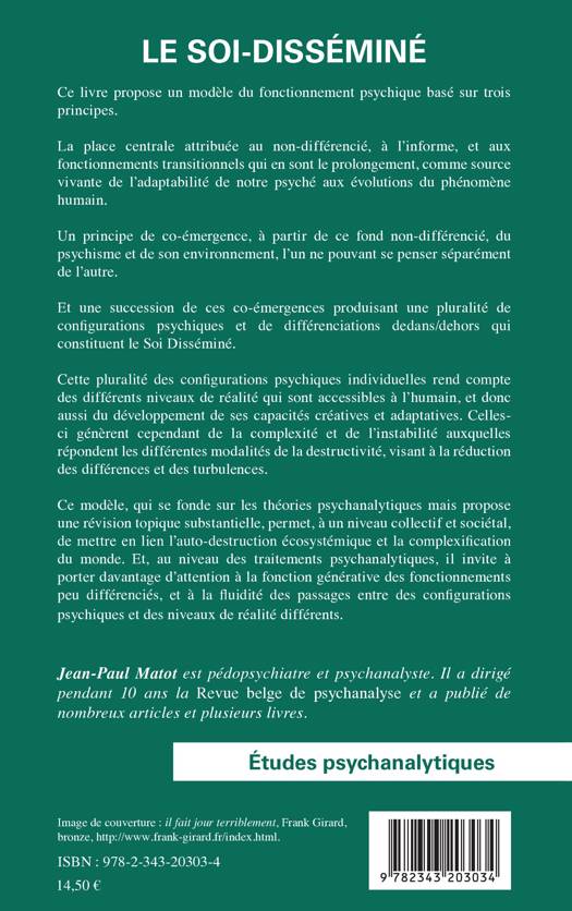 Ce livre propose un modèle de fonctionnement psychique basé sur trois principes. La place centrale attribuée au non-différencié, à l'informe et aux fonctionnements transitionnels qui en sont le prolongement, comme source vivante de l'adaptabilité de notre psyché aux évolutions du phénomène humain. Un principe de co-émergence, à partir de ce fond non-différencié du psychisme et de son environnement, l'un ne pouvant se penser séparément de l'autre. Et une succession de ces co-émergences produisant une pluralité de configurations psychiques et de différenciations dedans/dehors qui constituent le Soi Disséminé.