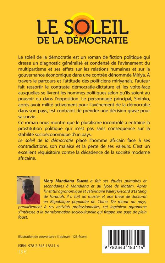 Le soleil de la démocratie est un roman de fiction politique qui dresse un diagnostic généralisé et condensé de l'avènement du multipartisme et ses effets sur les relations humaines et sur la gouvernance économique dans une contrée dénommée Miriya. Le personnage principal, Sininko, après avoir milité activement pour l'avènement de la démocratie dans son pays, est contraint de prendre une décision grave pour sa survie. Ce roman place l'homme africain face à ses contradictions, son malaise et la perte de ses valeurs. C'est un vrai réquisitoire contre la décadence de la société moderne africaine.