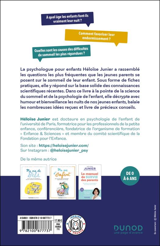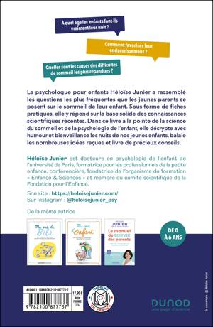 La psychologue pour enfants Héloïse Junier a rassemblé les questions les plus fréquentes que les jeunes parents se posent sur le sommeil de leur enfant. Dans cet ouvrage, conçu sous forme de fiches pratiques, elle y répond sur la base solide des connaissances scientifiques récentes sur le sommeil et la psychologie de l’enfant. Elle décrypte avec humour et bienveillance les nuits des jeunes enfants, balaie les idées reçues et livre de précieux conseils. Préface de Catherine Guéguen