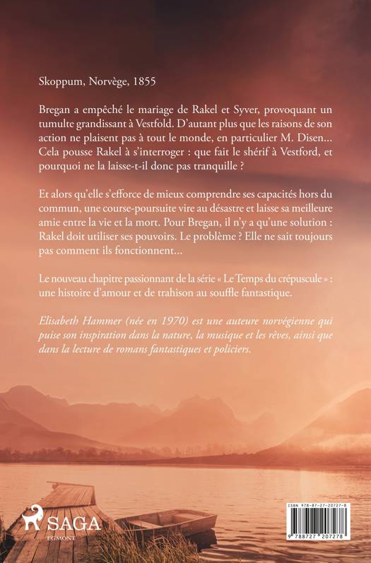 Skoppum, Norvège, 1855 Bregan a empêché le mariage de Rakel et Syver, provoquant un tumulte grandissant à Vestfold. D'autant plus que les raisons de son action ne plaisent pas à tout le monde, en particulier M. Disen... Cela pousse Rakel à s'interroger : que fait le shérif à Vestford, et pourquoi ne la laisse-t-il donc pas tranquille ? Et alors qu'elle s'efforce de mieux comprendre ses capacités hors du commun, une course-poursuite vire au désastre et laisse sa meilleure amie entre la vie et la mort. Pour Bregan, il n'y a qu'une solution : Rakel doit utiliser ses pouvoirs. Le problème ? Elle ne sait toujours pas comment ils fonctionnent... Le nouveau chapitre passionnant de la série « Le Temps du crépuscule » : une histoire d'amour et de trahison au souffle fantastique.