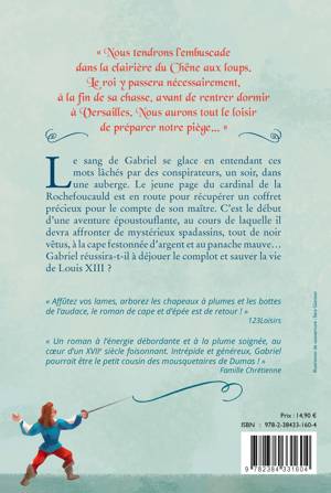 « Nous tendrons l’embuscade dans la clairière du Chêne aux loups. Le roi y passera nécessairement, à la fin de sa chasse, avant de rentrer dormir à Versailles. Nous aurons tout le loisir de préparer notre piège… » Le sang de Gabriel se glace en entendant ces mots lâchés par des conspirateurs, un soir, dans une auberge. Le jeune page du cardinal de la Rochefoucauld est en route pour récupérer un coffret précieux pour le compte de son maître. C’est le début d’une aventure époustouflante, au cours de laquelle il devra affronter de mystérieux spadassins, tout de noir vêtus, à la cape festonnée d’argent et au panache pourpre… Gabriel réussira-t-il à déjouer le complot et sauver la vie de Louis XIII ?