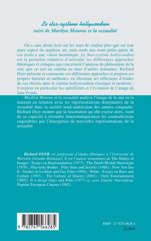 Le "Star-système hollywoodien" articule les différentes approches théoriques et critiques qui concernent l'analyse du phénomène de la star. L'auteur présente et commente ces différentes approches et propose ses propres théories et méthodes, en illustrant ses réflexions d'études de cas choisis dans le cinéma hollywoodien classique et moderne (il s'intéresse en outre à l'image de Jane Fonda). "Marilyn Monroe et la sexualité" analyse l'image de la star en la mettant en relation avec les représentations dominantes de la sexualité dans la société nord-américaine des années cinquante.