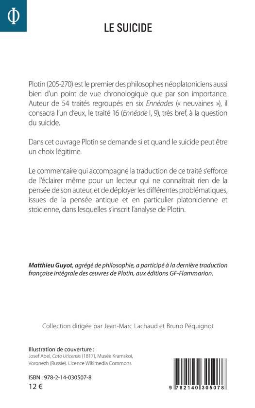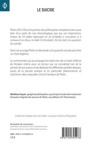 Plotin (205-270) est le premier des philosophes néoplatoniciens aussi bien d'un point de vue chronologique que par son importance. Auteur de 54 traités regroupés en six Ennéades (« neuvaines »), il consacra l'un d'eux, le traité 16 (Ennéade I, 9), très bref, à la question du suicide. Dans cet ouvrage Plotin se demande si et quand le suicide peut être un choix légitime. Le commentaire qui accompagne la traduction de ce traité s'efforce de l'éclairer même pour un lecteur qui ne connaîtrait rien de la pensée de son auteur, et de déployer les différentes problématiques, issues de la pensée antique et en particulier platonicienne et stoïcienne, dans lesquelles s'inscrit l'analyse de Plotin.