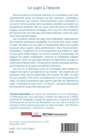 La situation de crise que nous traversons laisse craindre ou espérer un changement profond. C’est aussi celle des mots et des images. Et si les frontières de l’oeuvre d’art ne sont pas clairement définies, celles du sujet ne le sont pas davantage. Ses frontières sont malléables, dépendantes des contrées extérieures auxquelles il se frotte sans cesse. C’est un sujet en mouvement dans une société toujours plus rapide, plus performante, plus financiarisée. Cependant, l’agitation qui l'habite n’a pas pour seule origine un univers sociétal économique. Les espaces ou objets esthétiques, naturels ou méditatifs influent également. Qu'il soit créateur ou spectateur, le sujet se confronte à l’oeuvre d’art. Les arts et la littérature sont ici convoqués pour penser le rapport du sujet à son identité et au monde. En quoi les arts contribuent-ils à la construction du sujet ? En quoi la rencontre avec l’oeuvre agit-elle sur son identité ? Comment le sujet est-il "à l’oeuvre" lorsqu’il rencontre ou crée des oeuvres ?