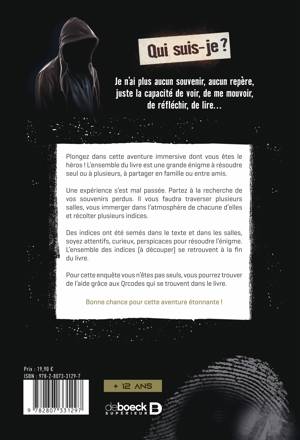 "En ouvrant les yeux, vous êtes pris d’un mal de tête... En passant la main dans les cheveux, elle se couvre de sang... Vous êtes blessé, groggy... désorienté... Comment ? Pourquoi ? Où suis-je ? Et l'obsédante question : Qui suis-je ?” Voici comment débute l’aventure de ce livre à la frontière entre l’escape game et le livre dont vous êtes le héros, vous avez le choix de changer de pièce, d’ouvrir des cadenas, de casser des codes grâce aux indices donnés dans l’histoire, etc. Votre objectif : Trouver qui vous êtes, où vous êtes et comment vous en sortir. La vraie question : Êtes-vous prêt ?