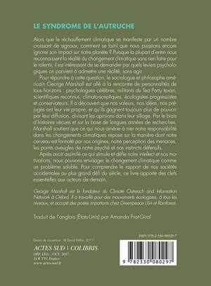 Pour répondre à cette question, le sociologue et philosophe américain George Marshall est allé à la rencontre de personnalités de tous horizons : psychologues célèbres, militants du Tea Party texan, scientifiques reconnus, climato-sceptiques, écologistes progressistes et conservateurs. Il a découvert que nos valeurs, nos idées, nos préjugés ont leur vie propre, et qu'ils gagnent toujours plus de pouvoir par leur diffusion, divisant les opinions dans leur sillage. Par le biais d'histoires vécues et sur la base de longues années de recherches, Marshall soutient que ce qui nous amène à nier notre responsabilité dans les changements climatiques repose sur la manière dont notre cerveau est formaté par nos origines, notre perception des menaces, les points aveugles de notre psyché et nos instincts défensifs.