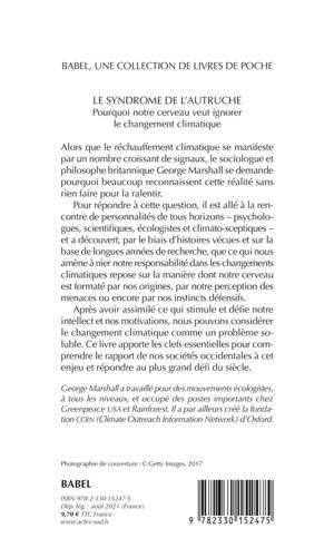 Alors que le réchauffement climatique se manifeste par un nombre croissant de signaux, le sociologue et philosophe britannique George Marshall se demande pourquoi beaucoup reconnaissent cette réalité sans rien faire pour la ralentir. Pour répondre à cette question, il est allé à la rencontre de personnalités de tous horizons - psychologues, scientifiques, écologis tes et climato- sceptiques - et a découvert, par le biais d'histoires vécues et sur la base de longues années de recherche, que ce qui nous amène à nier notre responsabilité dans les changements climatiques repose sur la manière dont notre cerveau est formaté par nos origines, notre perception des menaces ou encore nos instincts défensifs. Après avoir assimilé ce qui stimule et défie notre intellect et nos motivations, nous pouvons considérer le changement climatique comme un problème soluble. Ce livre apporte les clefs essentielles pour comprendre le rapport de nos sociétés occidentales à cet enjeu et répondre au plus grand défi du siècle.