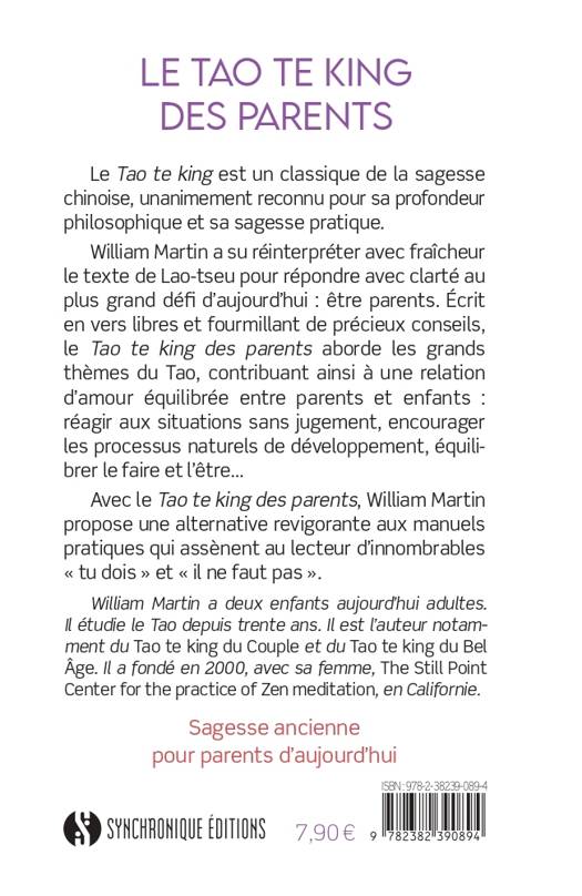 Le Tao Te King est un classique de la sagesse chinoise, unanimement reconnu pour sa profondeur philosophique et sa sagesse pratique. William Martin a su réinterpréter avec fraîcheur le texte de Lao-tseu pour répondre avec clarté au plus grand défi d'aujourd'hui : être parents. Ecrit en vers libres et fourmillant de précieux conseils, le Tao Te King des Parents aborde les grands thèmes du Tao, contribuant ainsi à une relation d'amour équilibrée entre parents et enfants : réagir aux situations sans jugement, encourager les processus naturels de développement, équilibrer le faire et l'être… Avec le Tao Te King des Parents, William Martin propose une alternative revigorante aux manuels pratiques qui assènent au lecteur d'innombrables "tu dois" et "il ne faut pas".