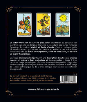 Le Rider-Waite est le tarot le plus utilisé au monde. Sa structure est la même que celle du tarot de Marseille ; cependant, ses cartes mineures figuratives le rendent intuitif et facile d’accès. C’est un puissant guide de développement qui permet de mettre en évidence des mécanismes inconscients afin de mieux se comprendre, faire les bons choix, et se bâtir un avenir harmonieux. L’ouvrage d’Emmanuelle Iger fournit une description détaillée des arcanes majeurs et mineurs, leur symbolique et interprétation : tirage à trois cartes ou tirage en croix pour répondre à une question précise, tirage relationnel ou tirage de choix pour évaluer une situation complexe et enfin tirage de la roue astrologique ou de la croix celtique pour susciter une réflexion plus générale. Ce coffret contient le jeu original de 78 lames « Premium Edition » de 1909 créé par A.E. Waite et Pamela Colman Smith publié par AGM-Urania.