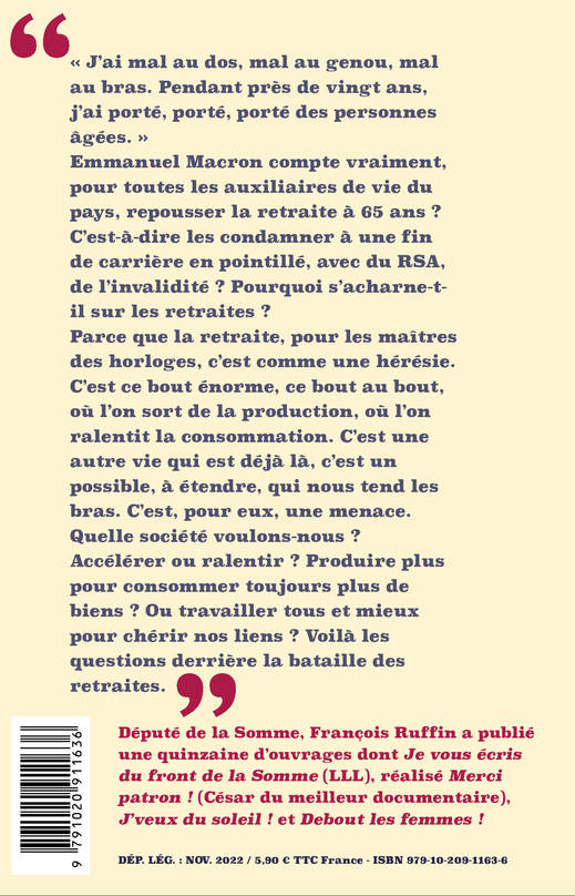 « J'ai mal au dos, mal au genou, mal au bras. Pendant près de vingt ans, j'ai porté, porté, porté des personnes âgées. ». Emmanuel Macron compte vraiment, pour toutes les auxiliaires de vie du pays, repousser la retraite à 65 ans ? C'est-à-dire les condamner à une fin de carrière en pointillé, avec du RSA, de l'invalidité ? Pourquoi s'acharne-t-il sur les retraites ? Parce que la retraite, pour les maîtres des horloges, c'est comme une hérésie. C'est ce bout énorme, ce bout au bout, où l'on sort de la production, où l'on ralentit la consommation. C'est une autre vie qui est déjà là, c'est un possible, à étendre, qui nous tend les bras. C'est, pour eux, une menace. Quelle société voulons-nous ? Accélérer ou ralentir ? Produire plus pour consommer toujours plus de biens ? Ou travailler tous et mieux pour chérir nos liens ? Voilà les questions derrière la bataille des retraites.