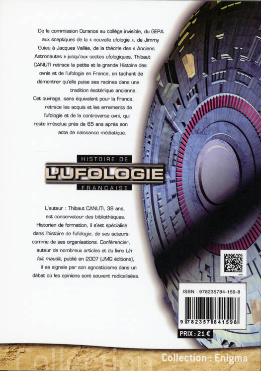 De la commission Ouranos au collège invisible, du GEPA aux sceptiques de la «nouvelle ufologie», de Jimmy Guieu à Jacques Vallée, de la théorie des «Anciens Astronautes» jusqu'aux sectes ufologiques, Thibaut Canuti retrace la petite et la grande Histoire des ovnis et de l'ufologie en France, en tachant de démontrer qu'elle puise ses racines dans une tradition ésotérique ancienne. Cet ouvrage, sans équivalent pour la France, retrace les acquis et les errements de l'ufologie et de la controverse ovni, qui reste irrésolue près de 65 ans après son acte de naissance médiatique. Thibaut Canuti est conservateur des bibliothèques. Historien de formation, il s'est spécialisé dans l'histoire de l'ufologie, de ses acteurs comme de ses organisations. Conférencier, auteur de nombreux articles et de ''Un fait maudit'', publié chez JMG éditions, il se signale par son agnosticisme dans un débat où les opinions sont souvent radicalisées.