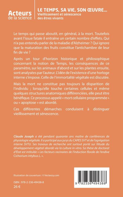 Le temps qui passe aboutit, en général, à la mort. Toutefois avant l’issue fatale il entraîne un certain nombre d’effets. Qui n’a pas entendu parler de la maladie d’Alzheimer ? Qui ignore que la maturation des fruits constitue l’antichambre de leur fin de vie ? Après un tour d’horizon historique et philosophique concernant la notion de Temps, les conséquences de ce paramètre, sur les animaux d’abord et sur les plantes ensuite, sont analysées par l’auteur. L’idée de l’existence d’une horloge interne s’impose. Celle de l’immortalité végétale est discutée. Mais la mort ne constitue pas toujours la disparition de l’individu ; lorsqu’elle touche certaines cellules et même quelques structures anatomiques différenciées, elle peut être bénéfique. Ce processus appelé « mort cellulaire programmée » ou « apoptose » est abordé. Ces différentes démarches conduisent à distinguer vieillissement et sénescence.