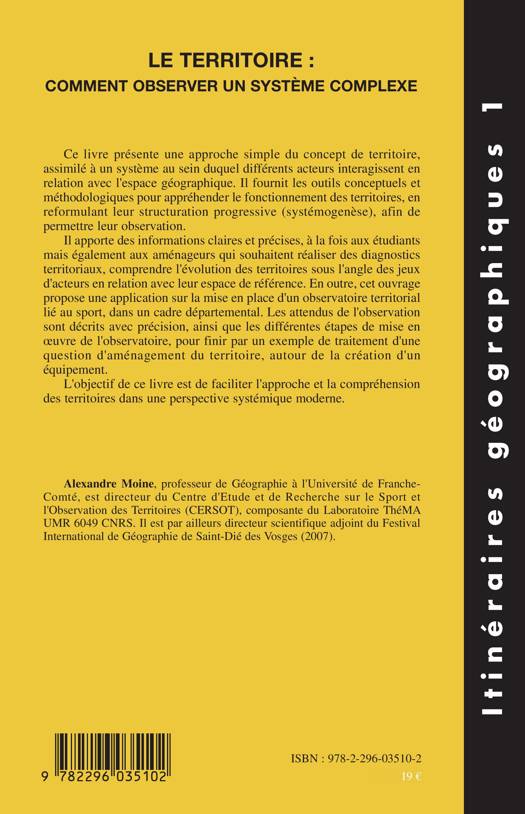 Ce livre présente une approche simple du concept de territoire, assimilé à un système au sein duquel différents acteurs interagissent en relation avec l'espace géographique. Il fournit les outils conceptuels et méthodologiques pour appréhender le fonctionnement des territoires, en reformulant leur structuration progressive afin de permettre leur observation. L'objectif de ce livre est de faciliter l'approche et la compréhension des territoires dans une perspective systémique moderne.