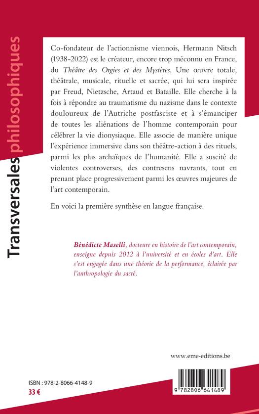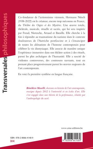 Le Théâtre des Orgies et des Mystères d'Hermann Nitsch est une oeuvre unique et singulière qui s'inscrit dans le contexte douloureux de l'Autriche post fasciste. De cette douleur va émerger un langage plastique radical visant, par la mise en scène de rituels et la répétition d'éléments basiques mais complexes, à se débarrasser des déterminismes sociétaux aliénants afin d'accéder, à une connaissance continue au sens de Bataille.