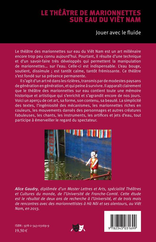 Le théâtre des marionnettes sur eau du Viêt Nam est un art millénaire encore trop peu connu aujourd'hui. Il s'agit d'un art né dans les rizières, transmis par de modestes paysans de génération en génération. Ce théâtre contient toute une mémoire historique et artistique qui s'enrichit et s'agrandit encore de nos jours. Alice Gaudry nous raconte la beauté de cet art, l'ingéniosité des mécanismes, la richesse des couleurs, les artifices et jets d'eau, tout participe à émerveiller le regard du spectateur.