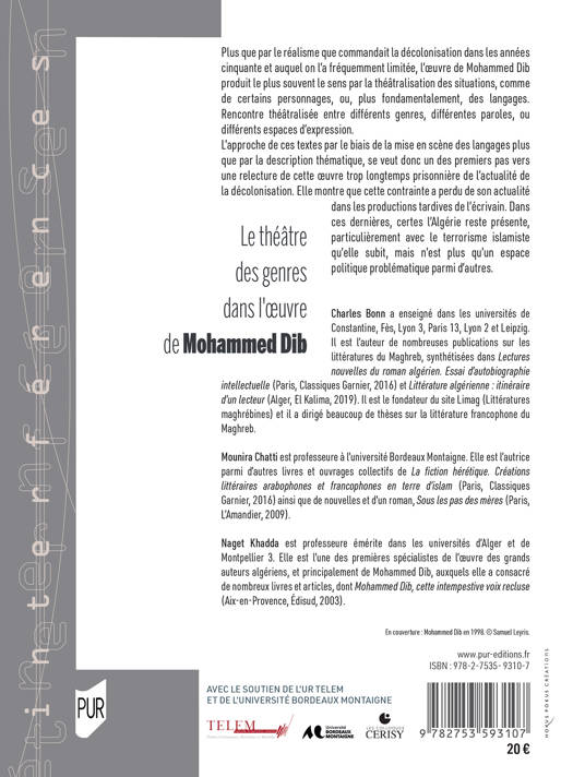 Plus que par le réalisme que commandait la décolonisation dans les années cinquante et auquel on l’a fréquemment limitée, l’oeuvre de Mohammed Dib produit le plus souvent le sens par la théâtralisation des situations, comme de certains personnages, ou, plus fondamentalement, des langages. Rencontre théâtralisée entre différents genres, différentes paroles, ou différents espaces d’expression.