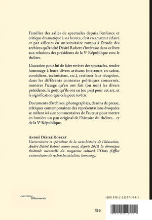 Donner à voir quelques aspects des relations que, de Charles de Gaulle à Emmanuel Macron, les huit présidents de la Ve République ont entretenues avec le théâtre : telle est l’ambition première de ce livre. Ce faisant, il s’agit aussi de célébrer les artisans des métiers de la scène en général. Par postulat initial, actrices et acteurs des spectacles ici recensés sont en effet considérés comme les représentants de l’ensemble de la corporation, à qui est ainsi rendu un hommage collectif. L’auteur s’efforce ici d’offrir au lecteur une vue sur des mises en scène de pièces, leur interprétation, leur réception par la presse, et aussi sur l’environnement administratif (notamment l’intervention du service du protocole de l’Élysée), le contexte politique particulier qui les ont entourées, l’action et les réactions des présidents à leur égard. COMMENT ? L’ouvrage révèle autant la personnalité et le comportement de nos dirigeants par rapport à l’art dramatique qu’il cherche à faire revivre sur le papier des spectacles, certains délibérément choisis pour représenter la France, d’autres distingués du simple fait de la présence présidentielle. L’ambition première de cet écrit est, comme celle du théâtre lui-même, de « divertir », sur le mode du divertissement « sérieux » – comme on parle de « jeu sérieux ». Le livre cherche ainsi à dévoiler un pan original de l’histoire de la Ve République qui n’a jamais été éclairé de cette façon concrète, au contact des rideaux de scène. Recourant à divers types d’archives (documents officiels appartenant au domaine public, issus du service du protocole de l’Élysée et consultés aux Archives nationales, articles de presse dus aux journalistes spécialisés, dessins et photographies), indiquant ou rappelant la teneur des pièces évoquées par des résumés de leur argumentation dramatique et le rappel de leur distribution, il entend offrir au lecteur une approche du « théâtre des présidents de la Ve République » à travers un entrelacs de mots et d’images, bref un mélange de spectacle et de politique. On peut alors parler de « politique-spectacle », conçue en un sens différent de l’acception habituelle, car se déroulant non dans les arènes parlementaires ou médiatiques, mais au sein même de salles de théâtre. QUI ? Universitaire et spécialiste de la socio-histoire de l’éducation, André Désiré ROBERT assure aussi, depuis 2010, la chronique théâtrale mensuelle du magazine culturel L’Ours (Office universitaire de recherche socialiste, lours.org). Spectateur depuis l’enfance, c’est en amateur éclairé de théâtre, et par ailleurs familier des archives, qu’il s’intéresse dans ce livre aux relations des présidents de la Ve République avec le théâtre. L’occasion pour lui de faire revivre des spectacles, rendre hommage à leurs divers artisans (metteurs en scène, comédiens, techniciens, etc.), restituer leur réception, dans les différents contextes politiques concernés, montrer l’usage qu’en ont fait (ou non) les divers présidents, le goût qu’ils ont eu (ou pas) pour cet art, et la signification que cela peut revêtir. Documents d’archives, photographies, dessins de presse, critiques se mêlent ici aux commentaires de l’auteur pour mettre en lumière un pan original de l’histoire du théâtre... et de la Ve République.