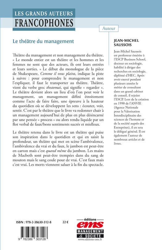 Théâtre du management et non management du théâtre. « Le monde entier est un théâtre et les hommes et les femmes ne sont que des acteurs, ils ont leurs entrées et leurs sorties. » Le début du monologue de la pièce de Shakespeare, Comme il vous plaira, indique la piste à suivre : pour comprendre le management et non l’expliquer, il faut le transporter au théâtre. Théâtre, vient du verbe grec theaomai, qui signifie « regarder ». Le théâtre devient alors un lieu d’où l’on peut voir le management, un management défini étroitement comme l’acte de faire faire, une épreuve à la hauteur du quotidien où se développent les sens : écouter, voir, sentir. C’est par le théâtre que le livre va redonner chair à un management aujourd’hui de plus en plus désincarné par une pensée « process » ou alors rendu liquide par un flot verbal de faux/bons sentiments sucrés et mielleux.