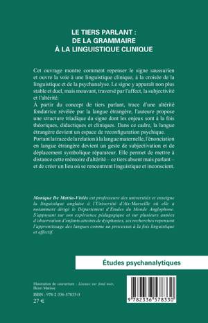 Cet ouvrage montre comment repenser le signe saussurien et ouvre la voie à une linguistique clinique, à la croisée de la linguistique et de la psychanalyse. Le signe y apparaît non plus stable et duel, mais mouvant, traversé par l'affect, la subjectivité et l'altérité. À partir du concept de tiers parlant, trace d'une altérité fondatrice révélée par la langue étrangère, l'auteure propose une structure triadique du signe dont les enjeux sont à la fois théoriques, didactiques et cliniques. Dans ce cadre, la langue étrangère devient un espace de reconfiguration psychique. Portant la trace de la relation à la langue maternelle, l'énonciation en langue étrangère devient un geste de subjectivation et de déplacement symbolique réparateur. Elle permet de mettre à distance cette mémoire d'altérité - ce tiers absent mais parlant - et de créer un lieu où se rencontrent linguistique et inconscient.