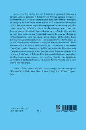 Cynthia prima fuit, Cynthia finis erit Cynthia fut la premiere, Cynthia sera la derniere. Dans son quatrieme et dernier recueil, Properce realise sa promesse: il inscrit le tombeau de son unique amante au coeur d'une Rome imperiale transfiguree par l'elegie. L'adieu a l'amour, a la fin du livre III, et le ralliement impromptu du poete a l'Empire ne sont que les penultiemes peripeties d'une aventure qui precedent de peu l'apotheose de l'heroine: dans le livre IV, fallax opus, oeuvre trompeuse, Properce subvertit le motif de l'immortalisation par la poesie des heros guerriers au profit de sa maitresse, une femme legere comme le genre qu'elle incarne. Plaisant paradoxe selon Paul Veyne, l'elegie est aussi l'ecriture, melee de joie et d'inquietude, d'une audace nouvelle: l'esclavage amoureux libere la poesie qui devient necessairement personnelle et subjective. Si l'amour sine modo, l'amour sans mesure, fou par fidelite, affide par folie, ne se dit pas dans la transparence d'une ecriture sincere, il demeure le signifie d'une authentique declaration: celle d'un poete mauvais genre qui, contre toute la tradition, le pouvoir et meme la loi, reclame le droit d'aimer et de le dire. Il lui faut pour cela developper un paradoxe, en meme temps plaisant et serieux: la recusatio de l'epopee, refus dramatise du genre noble et du chant patriotique, est, dans la Rome d'Auguste, une epreuve digne d'un heros epique.